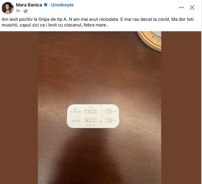 Deși Mara Bănică a început să simtă primele simptome de răceală și disconfort încă de acum două zile, abia recent a primit confirmarea oficială că este infectată cu Gripa A. Prezentatoarea TV a ales să împărtășească această informație cu urmăritorii săi prin intermediul unei postări pe Facebook, unde a publicat și rezultatul testului pozitiv.